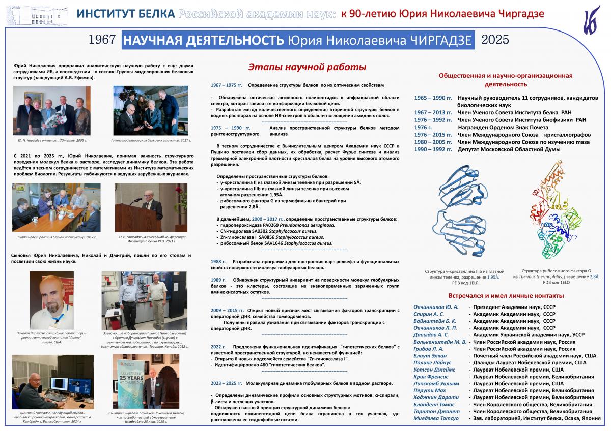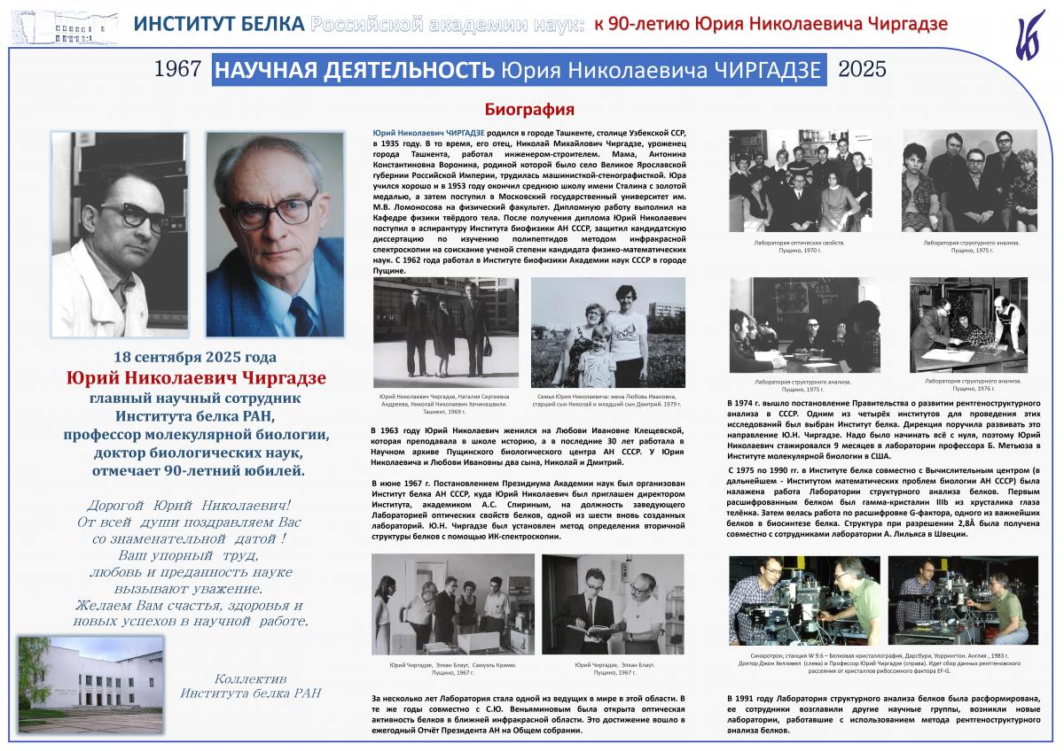 18 сентября 2025 года Юрий Николаевич Чиргадзе, главный научный сотрудник Института белка РАН, профессор молекулярной биологии, доктор биологических наук, отмечает 90-летний юбилей.